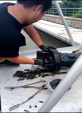 在檢修過程中,機修人員不怕臟、不嫌臭,直接下手將堵塞物、葉輪纏繞物一一清理出來,完美詮釋了污水人“一絲不茍、精益求精”的工作作風和優(yōu)良傳統(tǒng)。正是有這么一群可愛的人,在平凡的崗位默默奉獻,才保證了污水系統(tǒng)各個環(huán)節(jié)設(shè)備設(shè)施的正常運行,進而保證了出水水質(zhì)的穩(wěn)定達標(張曉偉)。