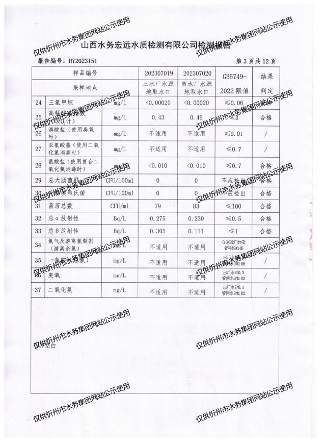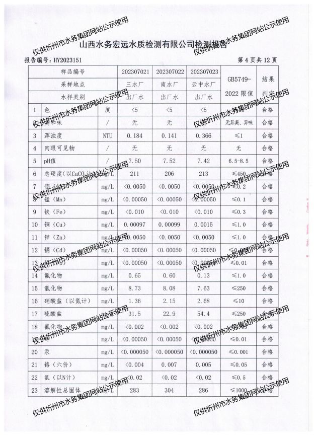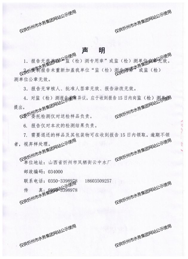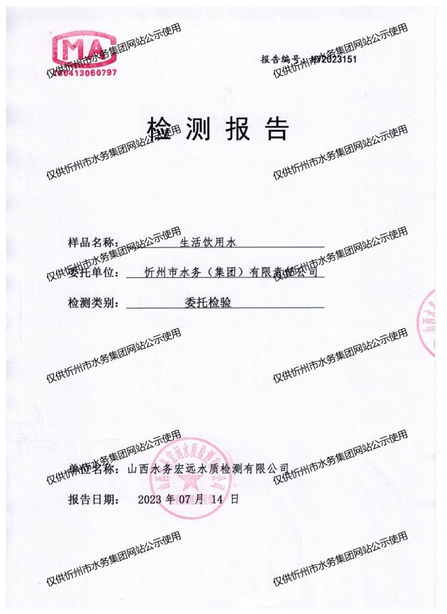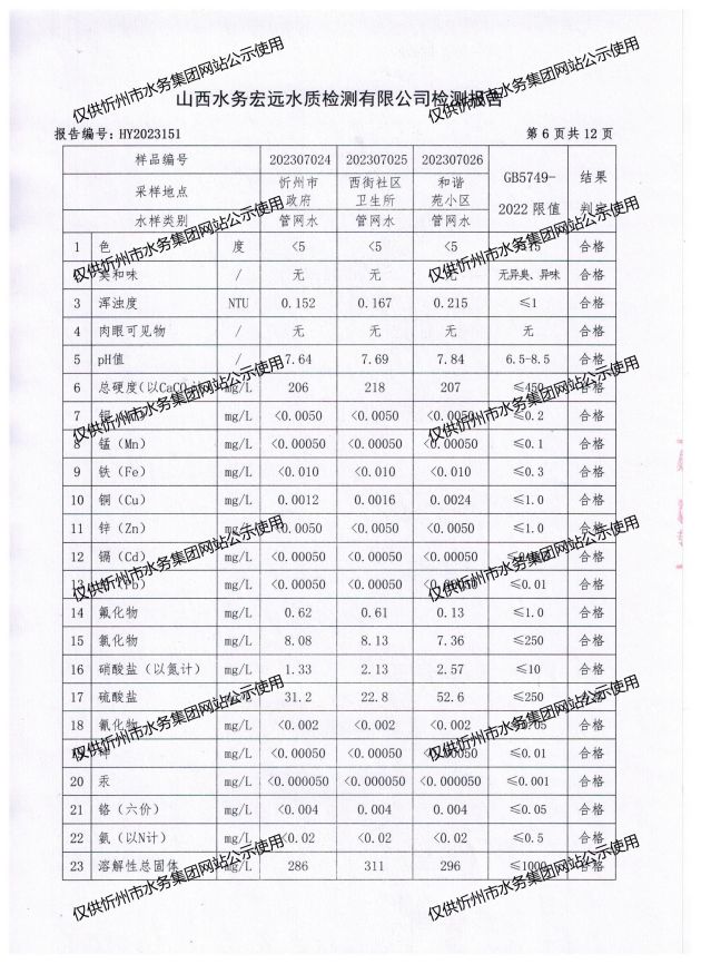 忻州城區(qū)公共供水水源水、出廠水、管網(wǎng)水、管網(wǎng)末梢水2023年7月份水質(zhì)信息公示